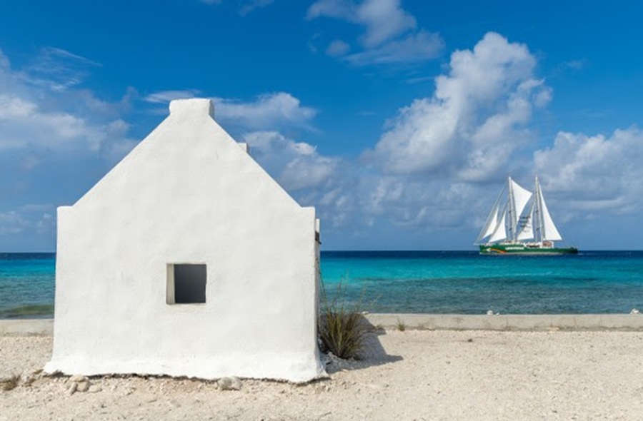 Greenpeace Ship Rainbow Warrior sailing by slavehuts Bonaire. © Casper Douma / Greenpeace
